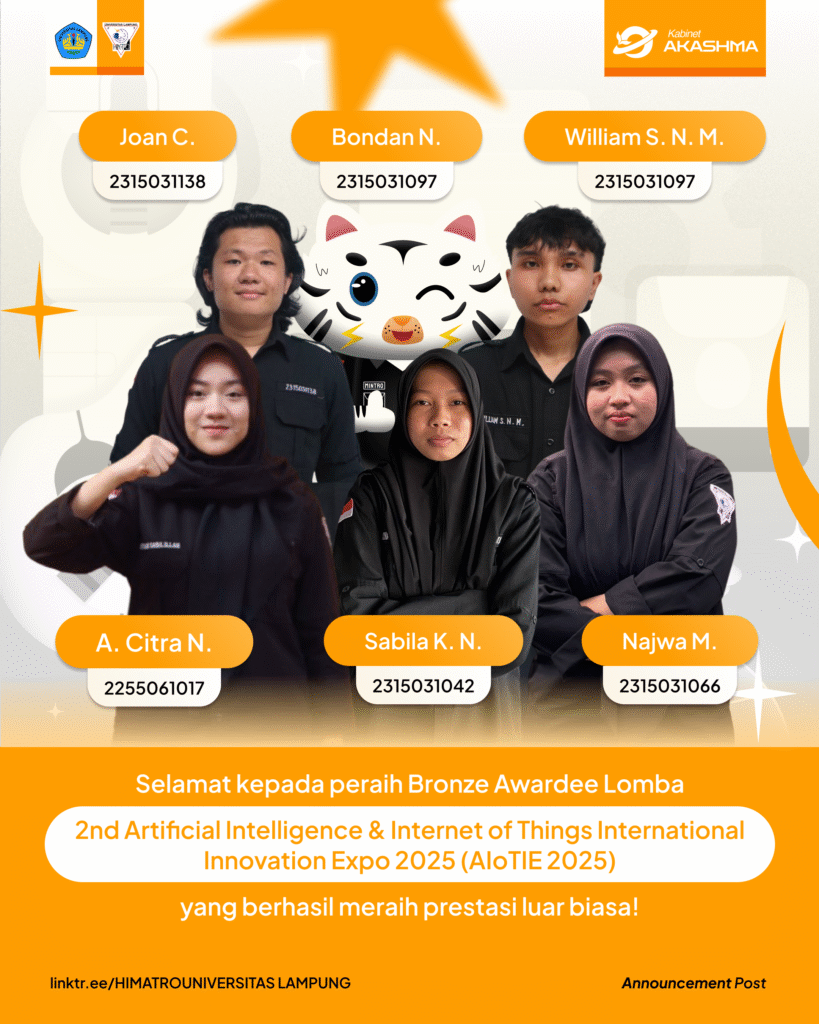 Prestasi membanggakan kembali diraih oleh mahasiswa/i Himpunan Mahasiswa Teknik Elektro (HIMATRO) Universitas Lampung. Tim hebat ini berhasil meraih Bronze Award dalam ajang bergengsi internasional, “2nd Artificial Intelligence & Internet of Things International Innovation Expo 2025 (AIoTIE 2025)”.